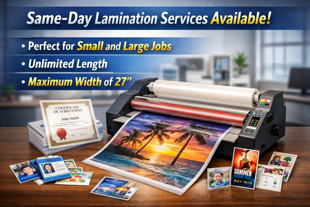 Need lamination for small or large jobs? We offer same-day lamination with unlimited length and a maximum width of 27".