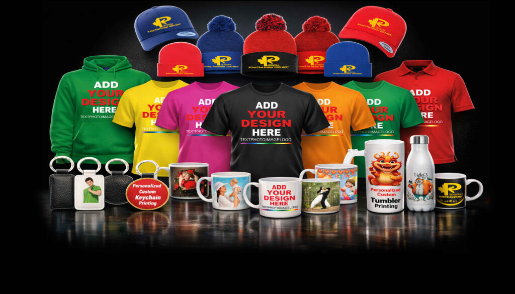 We offer same-day customization for T-shirts, frosted beer mugs, tumblers, bottles, mugs, keychains, embroidered beanies, embroidered hats & more.