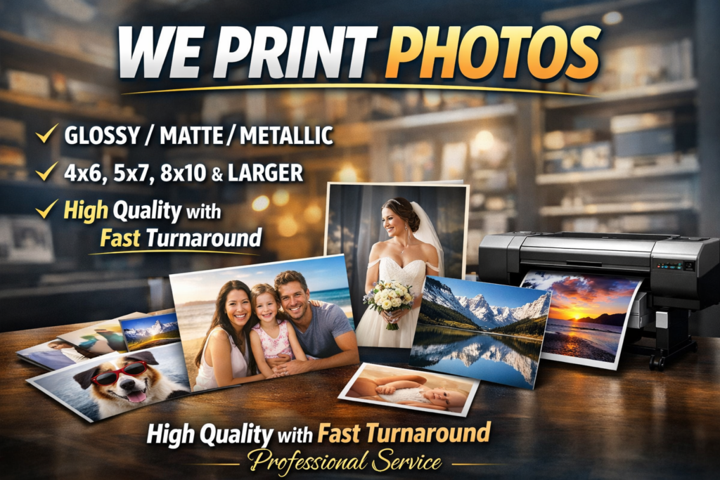 High-quality same-day photo printing available in glossy, matte, and metallic finishes, in sizes 4x6, 5x7, 8x10, and larger to suit your needs.